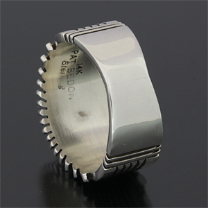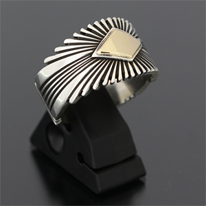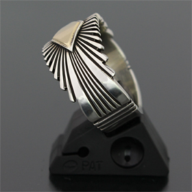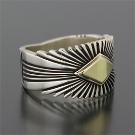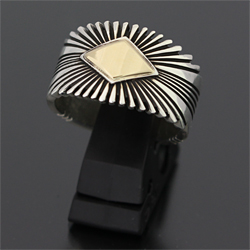 | NAVAJO/ナバホ族の女性アーティスト Patricia Bedonie/パトリシア・べドニーに制作依頼をしたリングです。 変わらず正確で美しいチゼルワークによるサンバーストデザインです。 ダイヤ型のパーツは14Kとシルバーのダブルダイヤモンドで仕上げて頂いています。 側面は凹凸が鋭いエッジが効いており、形状はテーパーになっているため指あたりがとてもよく、装着感の良いリングです。 | ||