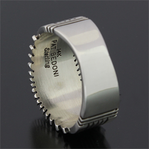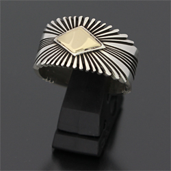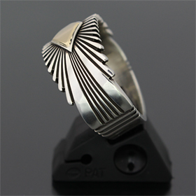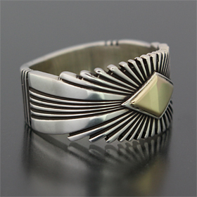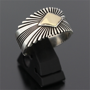 | NAVAJO/ナバホ族の女性アーティスト Patricia Bedonie/パトリシア・べドニーに制作依頼をしたリングです。 変わらず正確で美しいチゼルワークによるサンバーストデザインです。 ダイヤ型のパーツは14Kとシルバーのダブルダイヤモンドで仕上げて頂いています。 側面は凹凸が鋭いエッジが効いており、形状はテーパーになっているため指あたりがとてもよく、装着感の良いリングです。 | ||