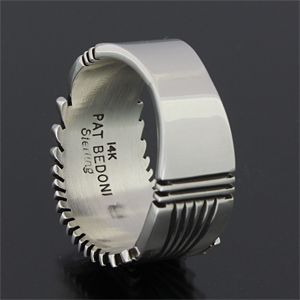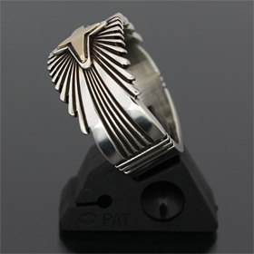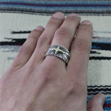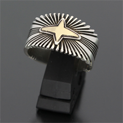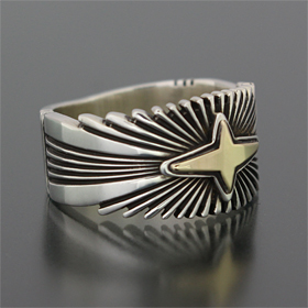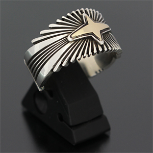 | NAVAJO/ナバホ族の女性アーティスト Patricia Bedonie/パトリシア・べドニーに制作依頼をしたリングです。 RIVER MAILの別注から生まれた4スターバーストです。4スターのパーツは14Kとシルバーのダブル4スターで仕上げて頂いています。 側面は凹凸が鋭いエッジが効いており、形状はテーパーになっているため指あたりがとてもよく、装着感の良いリングです。 | ||