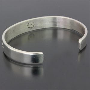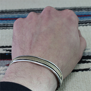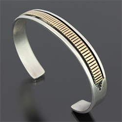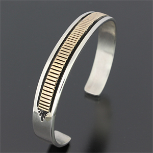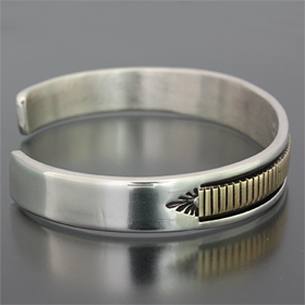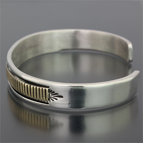 | NAVAJO/ナバホ族のアーティスト Bruce Morgan/ブルース・モーガンに制作を依頼したバングルです。 シンプルながらも深く正確なスタンプワーク、こちらは細かく規則的なストライプデザインになります。 センターラインは14Kを使用しているため高級感があり、スタイルを選びませんので様々な場面でお使い頂けます。 単体でも他のバングルとの重ね着けにも相性良くお楽しみ頂けます。 | ||