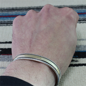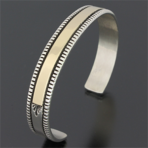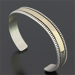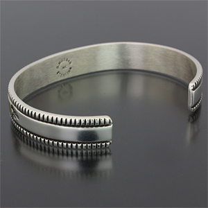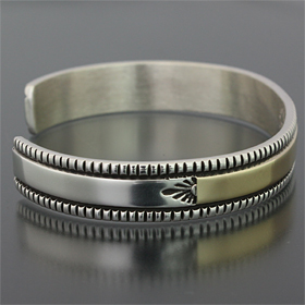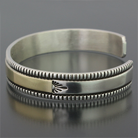 | NAVAJO/ナバホ族のアーティスト Bruce Morgan/ブルース・モーガンに制作を依頼したバングルです。 シンプルながらも深く正確なスタンプワーク、こちらはRIVER MAILの別注から生まれたチゼルワークによる作品です。 センターラインは14Kを使用しているため高級感があり、スタイルを選びませんので様々な場面でお使い頂けます。 単体でも他のバングルとの重ね着けにも相性良くお楽しみ頂けます。 | ||