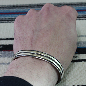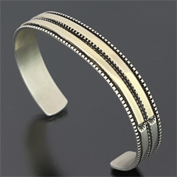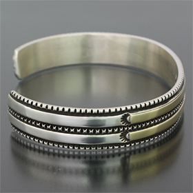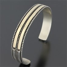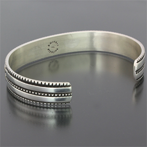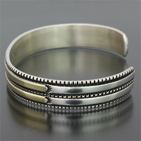 | NAVAJO/ナバホ族のアーティスト Bruce Morgan/ブルース・モーガンに制作を依頼したバングルです。 シンプルながらも深く正確なスタンプワーク、こちらはRIVER MAILの別注から生まれたチゼルワークによる作品です。 センターラインは14Kを使用しているため高級感があり、スタイルを選びませんので様々な場面でお使い頂けます。 単体でも他のバングルとの重ね着けにも相性良くお楽しみ頂けます。 | ||
