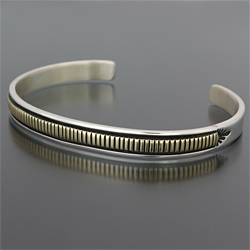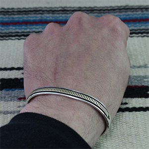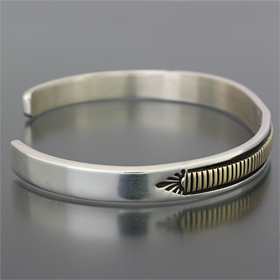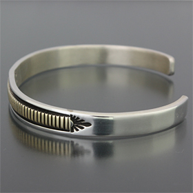 | NAVAJO/ナバホ族のアーティスト Bruce Morgan/ブルース・モーガンに制作を依頼したバングルです。 シンプルながらも深く正確なスタンプワーク、こちらは細かく規則的なストライプデザインになります。 センターラインは14Kを使用しているため高級感があり、スタイルを選びませんので様々な場面でお使い頂けます。 単体でも他のバングルとの重ね着けにも相性良くお楽しみ頂けます。 | ||