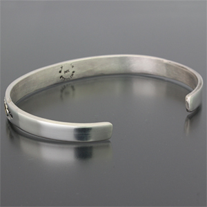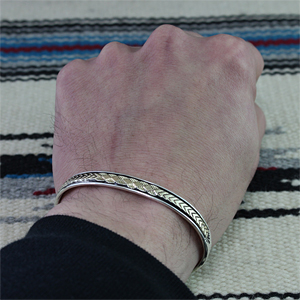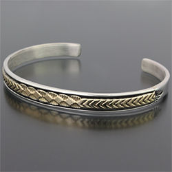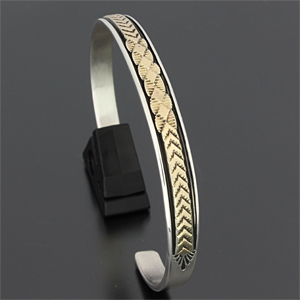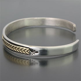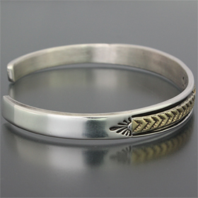 | NAVAJO/ナバホ族のアーティスト Bruce Morgan/ブルース・モーガンに制作を依頼したバングルです。 シンプルながらも深く正確なスタンプワーク、こちらはダイヤ/アローデザインになります。 センターラインは14Kを使用しているため高級感があり、スタイルを選びませんので様々な場面でお使い頂けます。 単体でも他のバングルとの重ね着けにも相性良くお楽しみ頂けます。 | ||