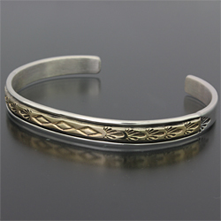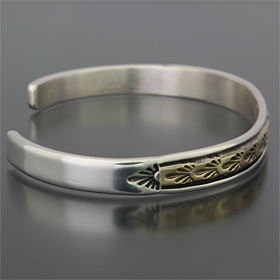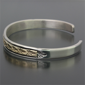 | NAVAJO/ナバホ族のアーティスト Bruce Morgan/ブルース・モーガンに制作を依頼したバングルです。 シンプルながらも深く正確なスタンプワーク、こちらはRIVER MAILの別注から生まれた3ダイヤ/フェザーデザインになります。 センターラインは14Kを使用しているため高級感があり、スタイルを選びませんので様々な場面でお使い頂けます。 単体でも他のバングルとの重ね着けにも相性良くお楽しみ頂けます。 | ||