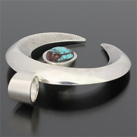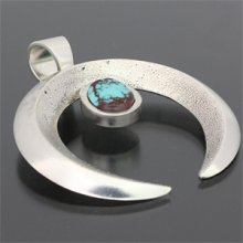 | NAVAJO/ナバホ族のアーティスト Darryl Begay/ダリル・ビゲイに制作を依頼したペンダントです。 ナバホジュエリーを代表するデザインのナジャです。石はビズビーがセットされています。 外側は磨きがかかっており、内側はトゥーファーストーンによる質感が残っています。石とのバランスが絶妙で、美し光沢が印象的です。 革紐、シルバーチェーン、コットンレース問わず、相性良くお使い頂けます。 | ||