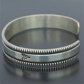 | NAVAJO/ナバホ族のアーティスト Bruce Morgan/ブルース・モーガンに制作を依頼したバングルです。 シンプルながらも深く正確なスタンプワーク、こちらはRIVER MAILの別注から生まれたチゼルワークによる作品です。 スタイルを選ばない着けやすさはもちろん、インディアンジュエリーが初めての方でも気軽にお楽しみ頂けます。 | ||