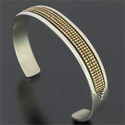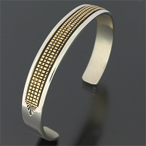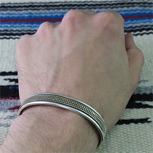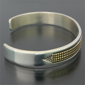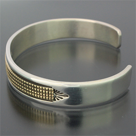 | NAVAJO/ナバホ族のアーティスト Bruce Morgan/ブルース・モーガンに制作を依頼したバングルです。 シンプルながらも深く正確なスタンプワーク、こちらはRIVER MAILの別注から生まれたデザインになります。 センターラインは14Kを使用しているため高級感があり、スタイルを選びませんので様々な場面でお使い頂けます。 単体でも他のバングルとの重ね着けにも相性良くお楽しみ頂けます。 | ||