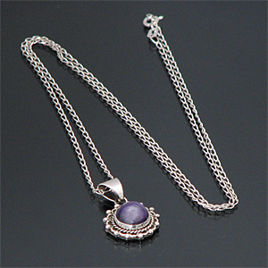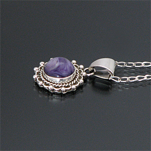 | NAVAJO/ナバホ族のアーティストがチャロライトを使用して制作したネックレスです。 艶やかなパープルに、シルクの様なまだら模様のチャロライトが使用されている、とても神秘的なネックレスです! スモールサイズでスタイリングしやすく、シルバーの土台にも細工が施されており、チャロライトとの相性も抜群です! 男女問わず、幅広いファッションにご活用頂けます。 | ||