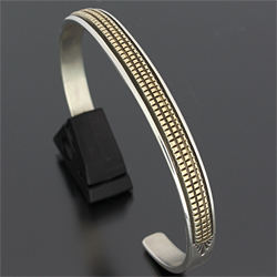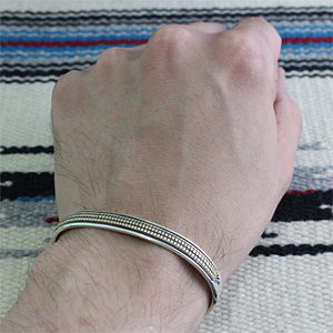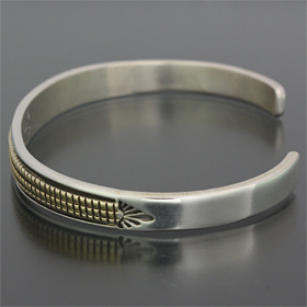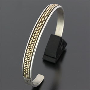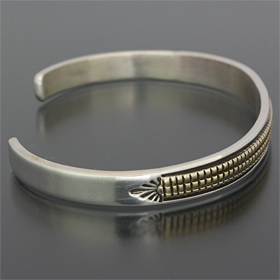 | NAVAJO/ナバホ族のアーティスト Bruce Morgan/ブルース・モーガンに制作を依頼したバングルです。 シンプルながらも深く正確なスタンプワーク、こちらはRIVER MAILの別注から生まれたデザインになります。 センターラインは14Kを使用しているため高級感があり、スタイルを選びませんので様々な場面でお使い頂けます。 単体でも他のバングルとの重ね着けにも相性良くお楽しみ頂けます。 | ||