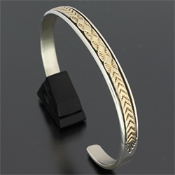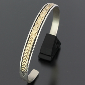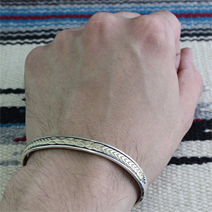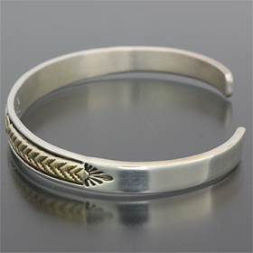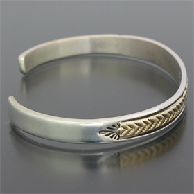 | NAVAJO/ナバホ族のアーティスト Bruce Morgan/ブルース・モーガンに制作を依頼したバングルです。 シンプルながらも深く正確なスタンプワーク、こちらはダイヤ/アローデザインになります。 センターラインは14Kを使用しているため高級感があり、スタイルを選びませんので様々な場面でお使い頂けます。 単体でも他のバングルとの重ね着けにも相性良くお楽しみ頂けます。 | ||