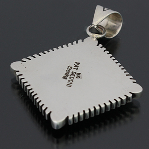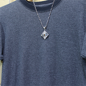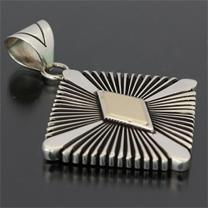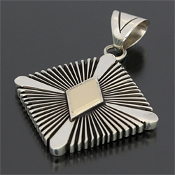 | NAVAJO/ナバホ族の女性アーティスト Patricia Bedonie/パトリシア・べドニーに制作依頼をしたペンダントです。 中心から外側に向かって大きく広がるサンバースト(太陽光線)をイメージした代表的作品です。 ダイヤ型のパーツは14Kとシルバーの組合せになり、10ゲージのフラットワイヤーを使用した約2.5mm厚のペンダントです。 美しいラインは正面だけでなく側面にも施されており、凹凸のある立体的な作品です。 男女問わずスタイルを選ばない安定感のある着けやすをお楽しみ頂けます。 | ||