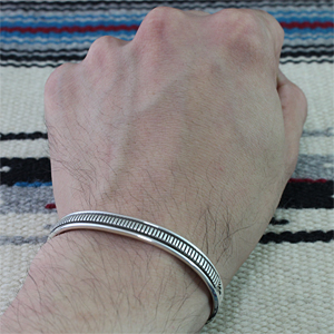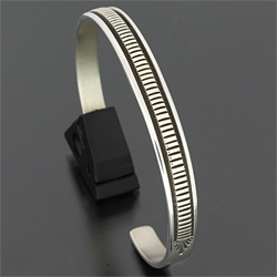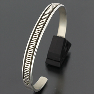 | NAVAJO/ナバホ族のアーティスト Bruce Morgan/ブルース・モーガンに制作を依頼したバングルです。 シンプルながらも深く正確なスタンプワーク、こちらのデザインはストライプになります。 スタイルを選ばない着けやすさはそのままで、一点でも重ねてでも楽しめる約7mm幅の作品です。 | ||