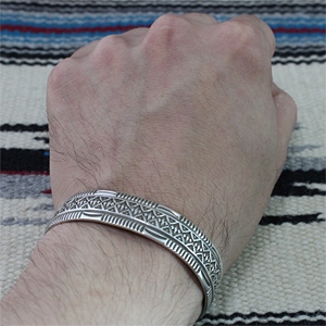 | NAVAJO/ナバホ族のアーティスト Darrell Cadmanに制作を依頼したバングルです。 深く正確なスタンプワークが施されているトラディショナルな作品です。 しっかりとした存在感を感じて頂ける約15mm幅となります。 スタイルを選ばない着けやすさは一点でも重ねてでも楽しめるバングルです。 | ||