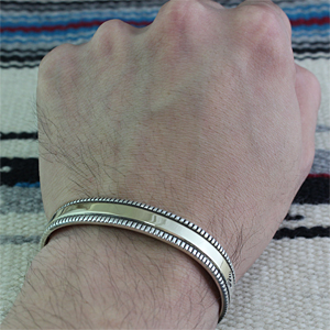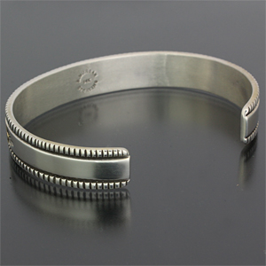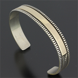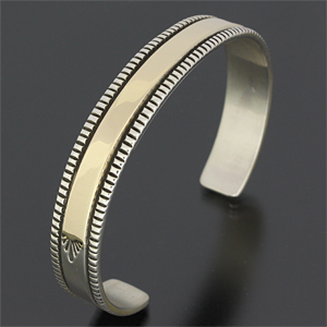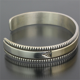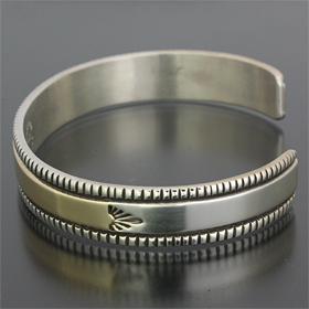 | NAVAJO/ナバホ族のアーティスト Bruce Morgan/ブルース・モーガンに制作を依頼したバングルです。 シンプルながらも深く正確なスタンプワーク、こちらはRIVER MAILの別注から生まれたチゼルワークによる作品です。 センターラインは14Kを使用しているため高級感があり、スタイルを選びませんので様々な場面でお使い頂けます。 単体でも他のバングルとの重ね着けにも相性良くお楽しみ頂けます。 | ||