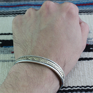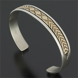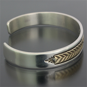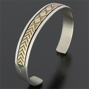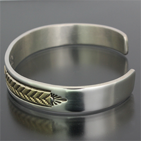 | NAVAJO/ナバホ族のアーティスト Bruce Morgan/ブルース・モーガンに制作を依頼したバングルです。 シンプルながらも深く正確なスタンプワーク、こちらのデザインは3ダイヤ/アローデザインになります。 センターラインは14Kを使用しているため高級感があり、スタイルを選びませんので様々な場面でお使い頂けます。 単体でも他のバングルとの重ね着けにも相性良くお楽しみ頂けます。 | ||