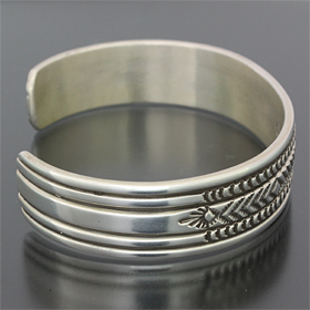| NAVAJO/ナバホ族のアーティスト Bruce Morgan/ブルース・モーガンに制作を依頼したバングルです。 シンプルながらも深く正確なスタンプワーク、こちらは3ダイヤ+2ダイヤ+アローデザインになります。 スタイルを選ばない着けやすさはもちろん、インディアンジュエリーが初めての方でも気軽にお楽しみ頂けます。 | ||