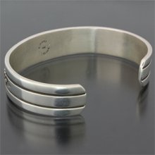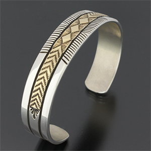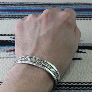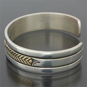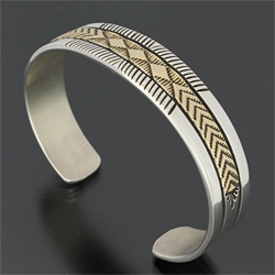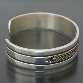 | NAVAJO/ナバホ族のアーティスト Bruce Morgan/ブルース・モーガンに制作を依頼したバングルです。 シンプルながらも深く正確なスタンプワーク、こちらはダイヤ/アローデザインになります。 センターラインは14Kを使用しているため高級感があり、スタイルを選びませんので様々な場面でお使い頂けます。 単体でも他のバングルとの重ね着けにも相性良くお楽しみ頂けます。 | ||