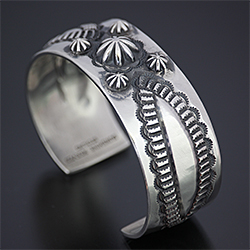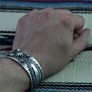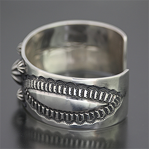 | NAVAJO/ナバホ族のアーティスト Sunshine Reeves/サンシャイン・リーブスに制作を依頼したバングルです。 両サイドは裏側からコツコツと叩きだしており、中心は凹凸のスタンプを使用しているため、立体感のあるバランスの良い作品に仕上がっています。 力強さと昔さらしを醸し出しており、使い込むほどより風合いを増していきます。 オールド感漂うバングルです。 | ||