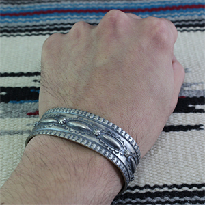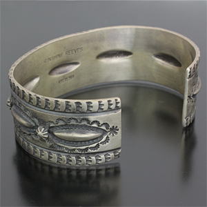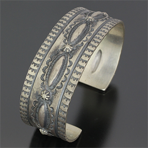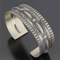 | NAVAJO/ナバホ族のアーティスト Sunshine Reeves/サンシャイン・リーブスに制作を依頼したバングルです。 凹凸のスタンプを使用しているため、立体感のあるバランスの良い作品に仕上がっています。 力強さと昔さらしを醸し出しており、使い込むほどより風合いを増していきます。 オールド感漂うバングルです。 | ||