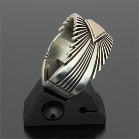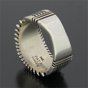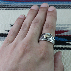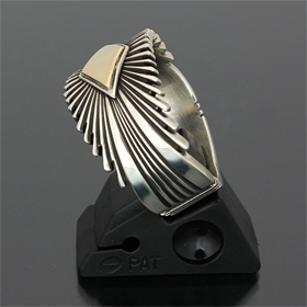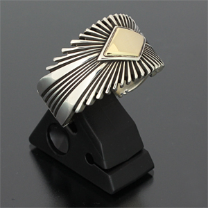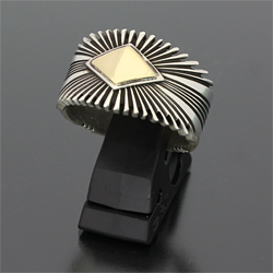 | NAVAJO/ナバホ族の女性アーティスト Patricia Bedonie/パトリシア・べドニーに制作依頼をしたリングです。 変わらず正確で美しいチゼルワークによるサンバーストデザインです。 ダイヤ型のパーツは14Kとシルバーのダブルダイヤモンドで仕上げて頂いています。 側面は凹凸が鋭いエッジが効いており、形状はテーパーになっているため指あたりがとてもよく、装着感の良いリングです。 | ||
