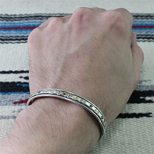 | NAVAJO/ナバホ族のアーティスト Bruce Morgan/ブルース・モーガンに制作を依頼したバングルです。 シンプルながらも深く正確なスタンプワーク、こちらはRIVER MAILの別注から生まれたスターデザインになります。 センターラインは14Kを使用しているため高級感があり、スタイルを選びませんので様々な場面でお使い頂けます。 単体でも他のバングルとの重ね着けにも相性良くお楽しみ頂けます。 | ||