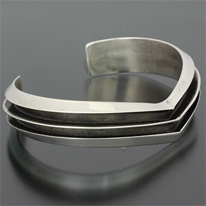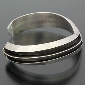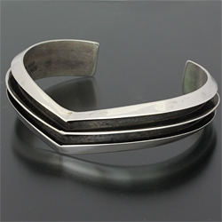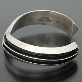 | NAVAJO/ナバホ族のアーティスト Tom Hawkが制作したV字型の1ラインバングルです。 銀と黒のコントラストが際立つシンプルでスタイルを問わない作品です。 独特のフォルムが印象的で、派手さはありませんがどなたでもお楽しみただけるバングルです。 | ||