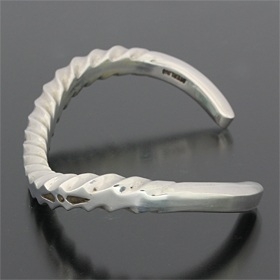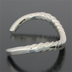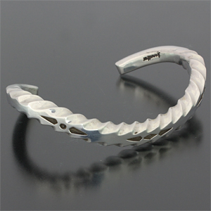 | NAVAJO/ナバホ族の女性アーティスト Jennifer Curtis/ジェニファー・カーティスに制作を依頼したバングルです。 柔らかいV字型の特徴あるフォルムに、ツイストを加えたRIVER MAILの別注から生まれたデザインです。 デザインを活かしつつ控えめにスタンプを施して頂きましたが、トータルバランスがよく、上品なスタイルの作品に仕上がっています。 芸術性の高いデザインの効果で存在感は十分に感じて頂けます。 | ||