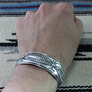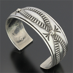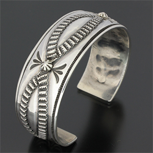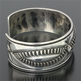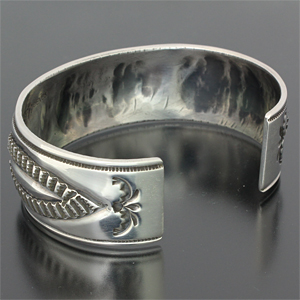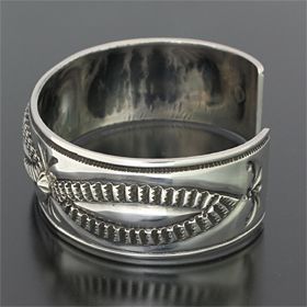 | NAVAJO/ナバホ族のアーティスト Sunshine Reeves/サンシャイン・リーブスに制作を依頼したバングルです。 美しい光沢が印象的、RIVER MAIL別注オールドスタイルでのオーダーです。 リポジ(打ち出し)で仕上げて頂いていますので、表面は立体的に仕上がっており、裏側を見て頂くとその様子が確認出来ます。 サンシャイン・リーブスの技術の高さを象徴する仕上がりです。 | ||