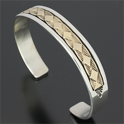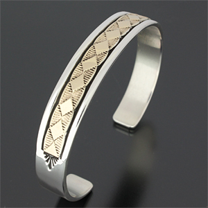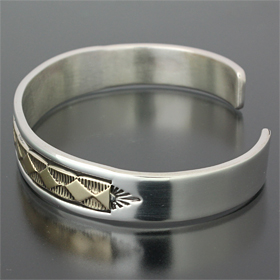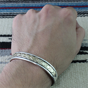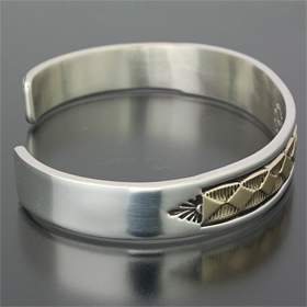 | NAVAJO/ナバホ族のアーティスト Bruce Morgan/ブルース・モーガンに制作を依頼したバングルです。 シンプルながらも深く正確なスタンプワーク、こちらのデザインはダイヤデザインになります。 センターラインは14Kを使用しているため高級感があり、スタイルを選びませんので様々な場面でお使い頂けます。 単体でも他のバングルとの重ね着けにも相性良くお楽しみ頂けます。 | ||