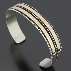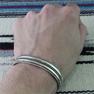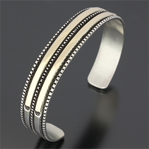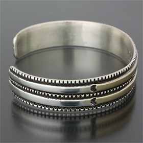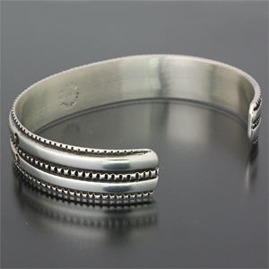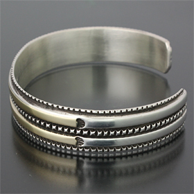 | NAVAJO/ナバホ族のアーティスト Bruce Morgan/ブルース・モーガンに制作を依頼したバングルです。 こちらはRIVER MAILの別注から生まれたチゼルワークによる作品です。 センターラインは14Kを使用しているため高級感があり、スタイルを選びませんので様々な場面でお使い頂けます。 単体でも他のバングルとの重ね着けにも相性良くお楽しみ頂けます。 | ||