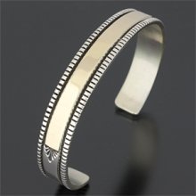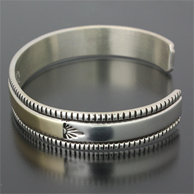 | NAVAJO/ナバホ族のアーティスト Bruce Morgan/ブルース・モーガンに制作を依頼したバングルです。 こちらはRIVER MAILの別注から生まれたチゼルワークによる作品です。 センターラインは14Kを使用しているため高級感があり、スタイルを選びませんので様々な場面でお使い頂けます。 単体でも他のバングルとの重ね着けにも相性良くお楽しみ頂けます。 | ||