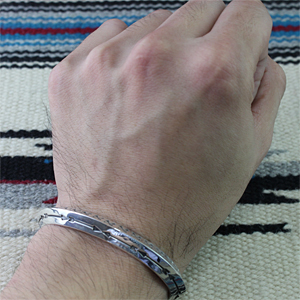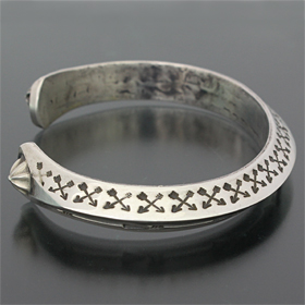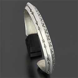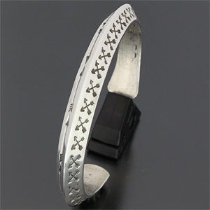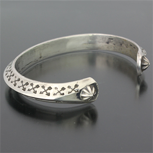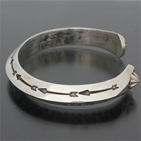 | NAVAJO/ナバホ族のアーティスト Sunshine Reeves/サンシャイン・リーブスに制作を依頼したバングルです。 RIVER MAIL別注トライアングルワイヤーでのオーダーです。美しい光沢が印象的な鏡面仕上げです。 デザインはアロー&ダブルアローで、エンド部分にコンチョを付けて頂きました。 サンシャイン・リーブスの技術の高さを象徴する仕上がりです。 | ||