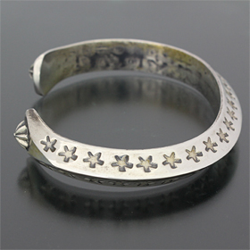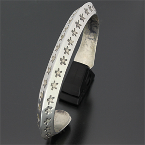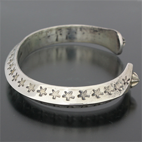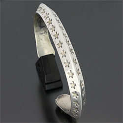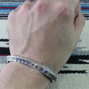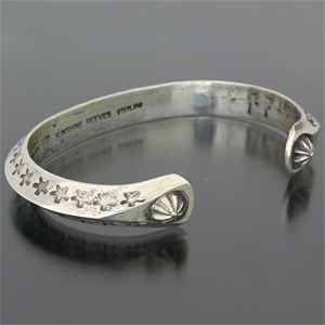 | NAVAJO/ナバホ族のアーティスト Sunshine Reeves/サンシャイン・リーブスに制作を依頼したバングルです。 RIVER MAIL別注トライアングルワイヤーでのオーダーです。美しい光沢が印象的な鏡面仕上げです。 デザインはスターで、エンド部分にコンチョを付けて頂きました。 サンシャイン・リーブスの技術の高さを象徴する仕上がりです。 | ||