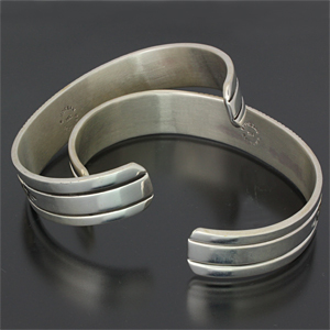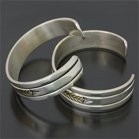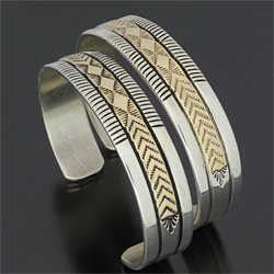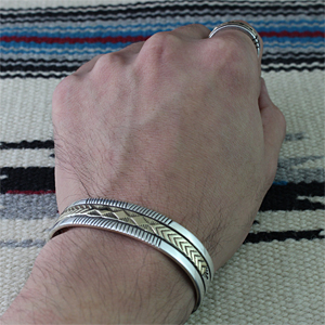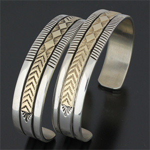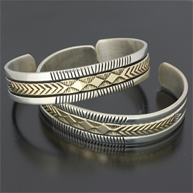| NAVAJO/ナバホ族のアーティスト Bruce Morgan/ブルース・モーガンに制作を依頼したバングルです。 シンプルながらも深く正確なスタンプワーク、こちらは3ダイヤ/アローデザインになります。 センターラインは14Kを使用しているため高級感があり、スタイルを選びませんので様々な場面でお使い頂けます。 単体でも他のバングルとの重ね着けにも相性良くお楽しみ頂けます。 | ||