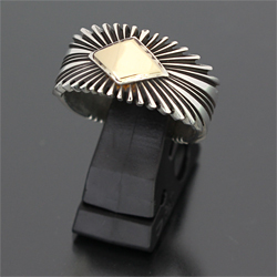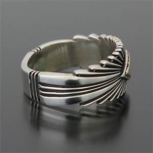 | NAVAJO/ナバホ族の女性アーティスト Patricia Bedonie/パトリシア・べドニーに制作依頼をしたリングです。 変わらず正確で美しいチゼルワークによるサンバーストデザインです。 ダイヤ型のパーツは14Kとシルバーのダブルダイヤモンドで仕上げて頂いています。 側面は凹凸が鋭いエッジが効いており、形状はテーパーになっているため指あたりがとてもよく、装着感の良いリングです。 | ||