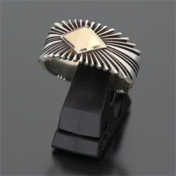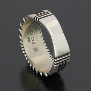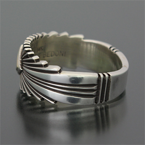 | NAVAJO/ナバホ族の女性アーティスト Patricia Bedonie/パトリシア・べドニーに制作依頼をしたリングです。 変わらず正確で美しいチゼルワークによるサンバーストデザインです。 ダイヤ型のパーツは14Kとシルバーのダブルダイヤモンドで仕上げて頂いています。 側面は凹凸が鋭いエッジが効いており、形状はテーパーになっているため指あたりがとてもよく、装着感の良いリングです。 | ||