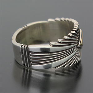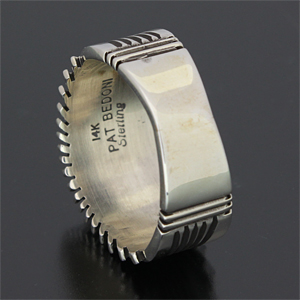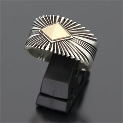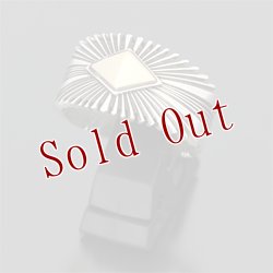 | NAVAJO/ナバホ族の女性アーティスト Patricia Bedonie/パトリシア・べドニーに制作依頼をしたリングです。 変わらず正確で美しいチゼルワークによるサンバーストデザインです。 ダイヤ型のパーツは14Kとシルバーのダブルダイヤモンドで仕上げて頂いています。 側面は凹凸が鋭いエッジが効いており、形状はテーパーになっているため指あたりがとてもよく、装着感の良いリングです。 | ||