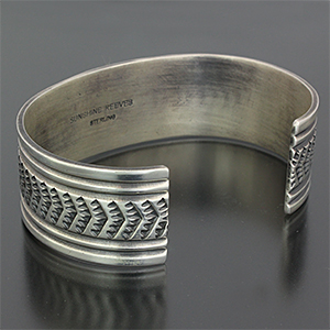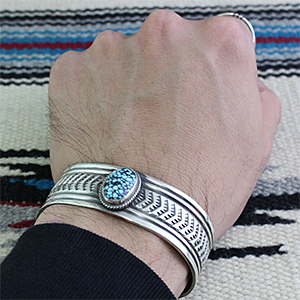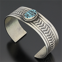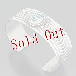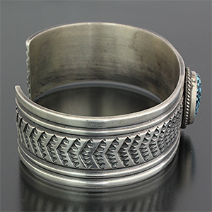 | NAVAJO/ナバホ族のアーティスト Sunshine Reeves/サンシャイン・リーブスに制作を依頼したバングルです。 シンプルなデザインでのオーダーです。 規則正しいスタンプが印象的で、石はキングマンをセットして頂きました。 サンシャイン・リーブスの技術の高さを象徴する仕上がりです。 | ||