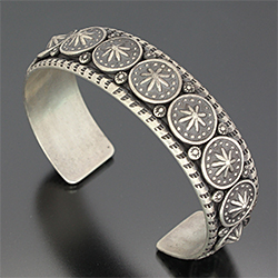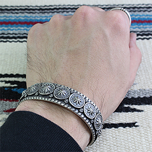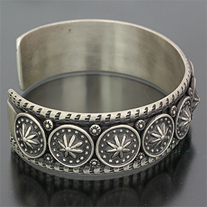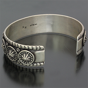 | NAVAJO/ナバホ族のIvan Howard/アイヴァン・ハワードに制作を依頼をしたバングルです。 艶消しの鈍い光沢が印象的なトラディショナルな作品です。重厚感のある独自のデザインは最新作になります。 アップリケによって装飾されたコンチョは迫力満点です。 センスの良さと技術の高さ両方を兼ね備えた素晴らしい仕上がりです。 | ||