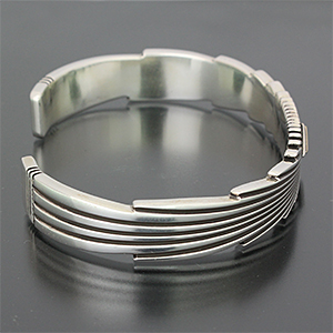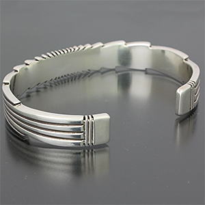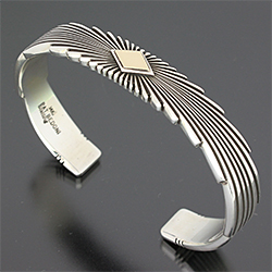 | NAVAJO/ナバホ族の女性アーティスト Patricia Bedonie/パトリシア・べドニーに制作依頼をしたバングルです。 中心から外側に向かって大きく広がるサンバースト(太陽光線)をイメージした代表的作品です。 ダイヤ型のパーツは14Kとシルバーの組合せになります。美しいラインは正面だけでなく側面にも施されており、凹凸のある立体的な作品です。 スタイルを選ばない安定感のある着けやすをお楽しみ頂けます。 | ||