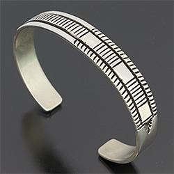 | NAVAJO/ナバホ族のアーティスト Bruce Morgan/ブルース・モーガンに制作を依頼したバングルです。 シンプルながらも深く正確なスタンプワーク、こちらはストライプ/プレーンになります。 スタイルを選ばない着けやすさはもちろん、インディアンジュエリーが初めての方でも気軽にお楽しみ頂けます。 | ||