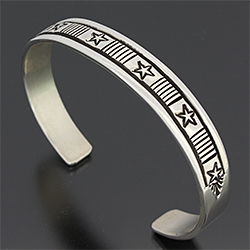 | NAVAJO/ナバホ族のアーティスト Bruce Morgan/ブルース・モーガンに制作を依頼したバングルです。 シンプルながらも深く正確なスタンプワーク、こちらはRIVER MAIL別注によるストライプ/スターになります。 スタイルを選ばない着けやすさはもちろん、インディアンジュエリーが初めての方でも気軽にお楽しみ頂けます。 | ||