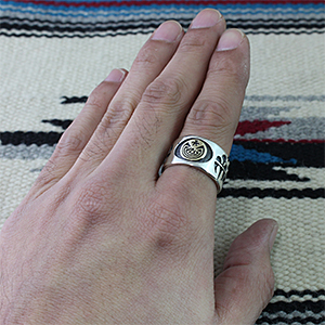 | HOPI/ホピ族のアーティスト Jason Takala/ジェイソン・タカラに制作を依頼をしたリングです。 長く愛されている代表的モチーフのメイズは14Kで制作されており、両サイドはレインクラウドのモチーフをデザインして頂きました。 昔から変わらないスタイル、どこか安心します。 経年変化による風合いが楽しみです。 | ||