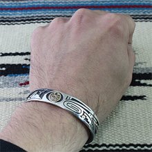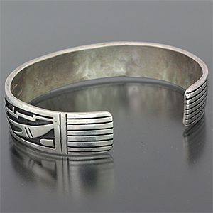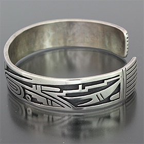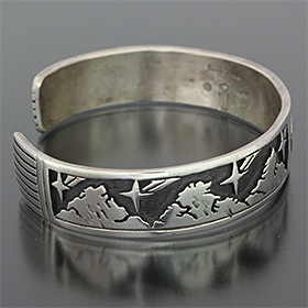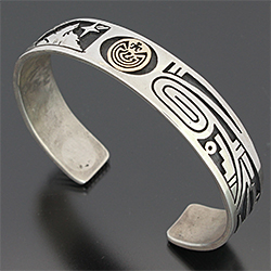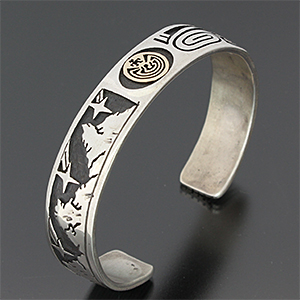 | HOPI/ホピ族のアーティスト Jason Takala/ジェイソン・タカラに制作を依頼をしたバングルです。 長く愛されている代表的モチーフのメイズは14Kで制作されており、サイドはプレイヤーフェザー&流星のデザインを入れて頂きました。 昔から変わらないスタイル、どこか安心します。 経年変化による風合いが楽しみです。 | ||