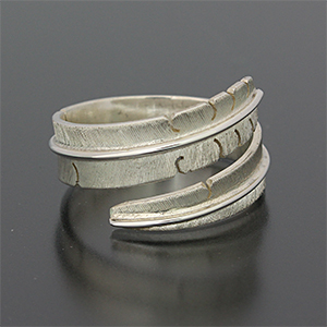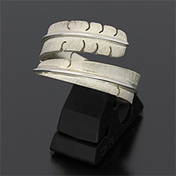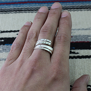 | ISLETA/イスレタ族のアーティスト Michael Kirk/マイケル・カークに制作を依頼をしたリングです。 フェザーの風合いを出すために細いたがねを用いて線を付けていき、本物のフェザーのように躍動感のある作品に仕上げられています。 インディアンジュエリーを代表する人気モチーフの一つです。 | ||