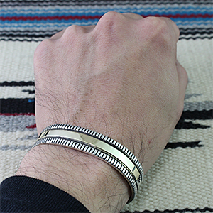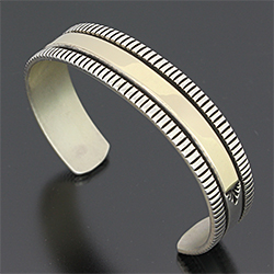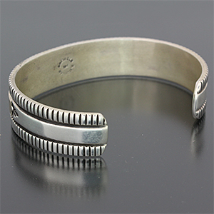 | NAVAJO/ナバホ族のアーティスト Bruce Morgan/ブルース・モーガンに制作を依頼したバングルです。 シンプルながらも深く正確なスタンプワーク、こちらはRIVER MAILの別注から生まれたチゼルワークによる作品です。 センターラインは14Kを使用しているため高級感があり、スタイルを選びませんので様々な場面でお使い頂けます。 単体でも他のバングルとの重ね着けにも相性良くお楽しみ頂けます。 | ||