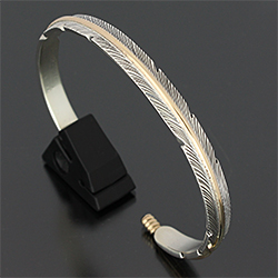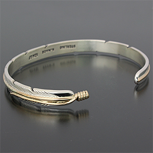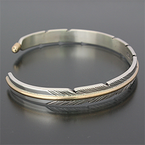 | NAVAJO/ナバホ族のアーティスト Harvey Mace/ハーヴィー・メイスに制作を依頼したバングルです。 躍動感のあるフェザーモチーフの作品です。 センターラインは12KGF(12金張り)が入っているため、洗練された落ち着いた魅力があり、シルバーとのバランスも絶妙です。 約6mm幅と細身ですので、スタイルを問わない着けやすさがあります。 美しい曲線と共にフェザーがしっかりとデザインされていますので、どなたでもお楽しみ頂けるバングルです。 | ||