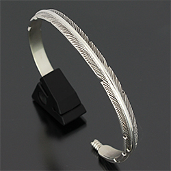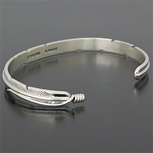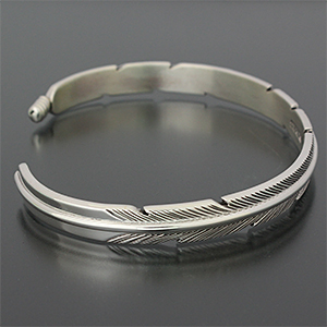 | NAVAJO/ナバホ族のアーティスト Harvey Mace/ハーヴィー・メイスに制作を依頼したバングルです。 躍動感のあるフェザーモチーフの作品です。約6mm幅と細身ですので、スタイルを問わない着けやすさがあります。 美しい曲線と共にフェザーがしっかりとデザインされていますので、どなたでもお楽しみ頂けるバングルです。 | ||
