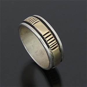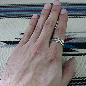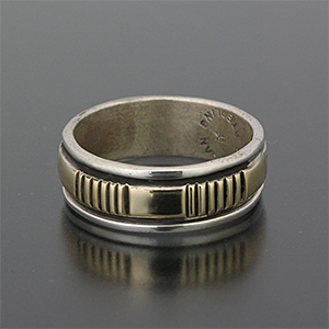 | NAVAJO/ナバホ族のアーティスト Bruce Morgan/ブルース・モーガンに制作依頼をしたリングです。 シンプルながらも深く正確なスタンプワーク、こちらはストライプ+プレーンデザインになります。 センターは14Kを使用しているため高級感があり、スタイルを選びませんので様々な場面でお使い頂けます。 他のリングとの相性も抜群です。 | ||